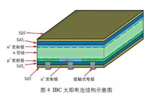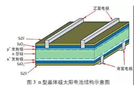 圖3為n型晶體硅太陽能電池結(jié)構(gòu)示意圖。n型晶體硅太陽能電池較p型晶體硅太陽電池具有少子壽命高、光致衰減小等優(yōu)點(diǎn),有更大的效率提升空間。同時(shí),n型晶體硅太陽能電池還具有弱光響應(yīng)好、溫度系數(shù)低等優(yōu)點(diǎn)。