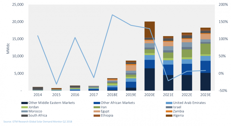 據(jù)GTMResearch的數(shù)據(jù)顯示,2018年中東和非洲地區(qū)的光伏需求有望增長170%。