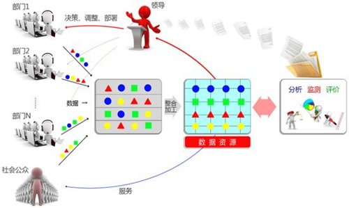 在以數(shù)據(jù)驅(qū)動(dòng)業(yè)務(wù)的模式中,數(shù)據(jù)中心將集中匯聚來(lái)自于各個(gè)業(yè)務(wù)部門(mén)及社會(huì)公眾的海量數(shù)據(jù)。以指標(biāo)體系為框架,將跨部門(mén)、跨領(lǐng)域的各類數(shù)據(jù)按照一定的秩序和內(nèi)部聯(lián)系進(jìn)行組織,形成統(tǒng)一的數(shù)據(jù)資源體系。以數(shù)據(jù)資源體系為基礎(chǔ),通過(guò)構(gòu)建各類監(jiān)測(cè)評(píng)價(jià)和分析應(yīng)用服務(wù),實(shí)質(zhì)性響應(yīng)日常管理和領(lǐng)導(dǎo)決策中的個(gè)性化需求,同時(shí)支持決策結(jié)果通過(guò)指標(biāo)體系直接反饋到各部門(mén)、各系統(tǒng),從而形成“決策”→“工作布置”→“工作落實(shí)”→“監(jiān)測(cè)評(píng)價(jià)”→“再?zèng)Q策”這個(gè)不斷循環(huán)的業(yè)務(wù)閉環(huán)。