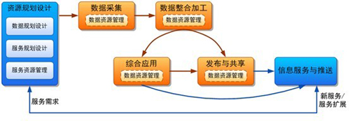 要在各業(yè)務(wù)處理基礎(chǔ)上歸納、抽象形成獨(dú)立于行業(yè)的、完備的、可動(dòng)態(tài)演進(jìn)的數(shù)據(jù)中心全業(yè)務(wù)流程。即規(guī)劃設(shè)計(jì)、數(shù)據(jù)采集、整合加工、綜合應(yīng)用、發(fā)布共享、信息服務(wù)與推送。