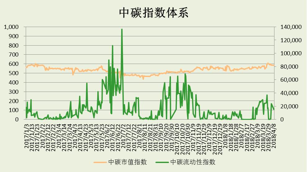 2017交易年度以來,截止到2018年4月10日,中碳市值指數(shù)為582 31點(diǎn),中碳流動(dòng)性指數(shù)8087 48點(diǎn)。2017交易年度迄今的中碳指數(shù)最新走勢(shì)如下。數(shù)
