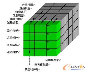 目前,較為流行的為集成化企業(yè)建??蚣?,如圖所示:是一個(gè)由生命周期維、視圖模型維、通用性層次維組成三維立方體結(jié)構(gòu),如圖1所示。