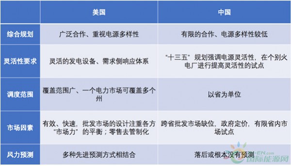 通過借鑒美國的成功經(jīng)驗,我們發(fā)現(xiàn)協(xié)調(diào)綜合規(guī)劃、重視電力系統(tǒng)靈活性、完善的電力市場和審慎的市場設(shè)計、擴(kuò)大調(diào)度范圍、改善風(fēng)力預(yù)測是普及可再生能源的關(guān)鍵因素。以下表格總結(jié)了中國和美國的電力領(lǐng)域的五個特點。