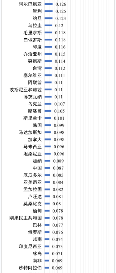 圖2 133個經(jīng)濟體工商業(yè)用戶平均電價(100萬千瓦時/年用電等級,含稅終端電價,2022年四季度,美元/千瓦時)
