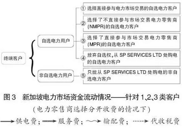 根據(jù)客戶的選擇不同,可將新加坡電力市場(chǎng)終端客戶分為如下5類,即選擇直接參與電力市場(chǎng)交易的自選電力客戶、選擇不直接參與市場(chǎng)交易電力零售商(NMPR)的自選電力客戶、選擇直接參與市場(chǎng)交易電力零售商的自選電力客戶、放棄自選權(quán)從SPServicesLtd處購(gòu)電的自選電力客戶和只能從SPServicesLtd處購(gòu)電的非自選電力用戶(見圖2)。