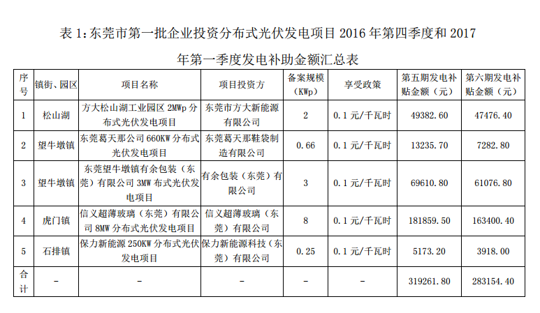 廣東東莞市前四批分布式光伏項目補助名單(2016-2017Q1)