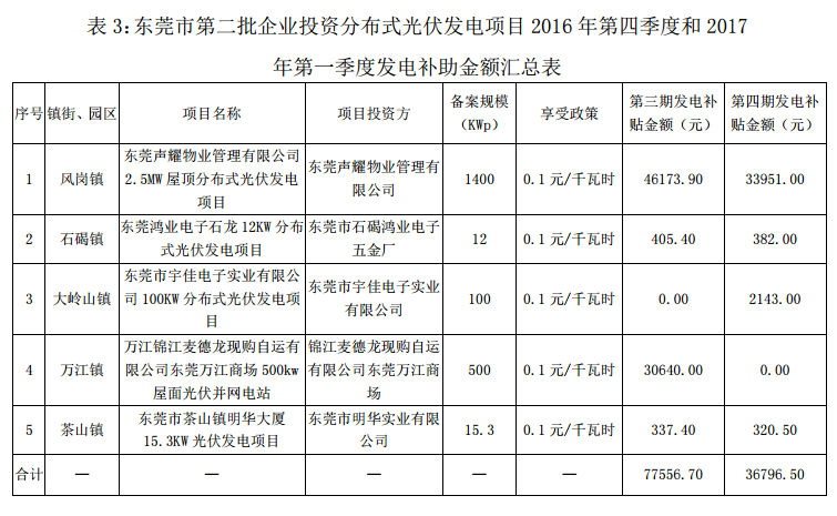 根據(jù)《關(guān)于確定2015年節(jié)能減排財政政策綜合示范城市建設示范項目財政政策和資金需求有關(guān)問題的通知》(東府辦會函〔2015〕108號)、《關(guān)于組織申報東莞市分布式光伏發(fā)電資金補助項目的通知》(東發(fā)改〔2015〕303號)以及《東莞市分布式光伏發(fā)電項目管理暫行辦法》(東發(fā)改〔2014〕178號)等相關(guān)文件要求,經(jīng)過項目網(wǎng)上備案、現(xiàn)場核查、征求意見、資金投入核查等工作流程,現(xiàn)將我市第一、二、三、四批分布式光伏發(fā)電項目2016年四季度和2017年一季度專項補助資金予以公示。