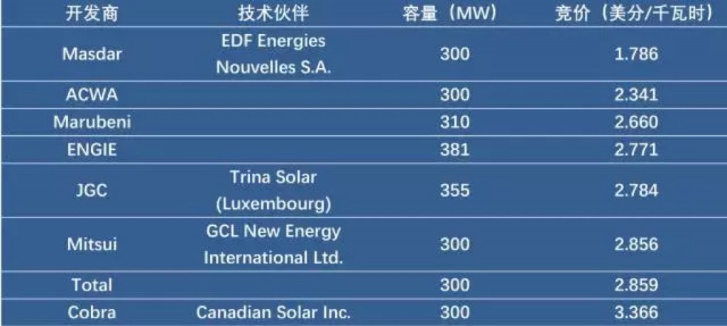 Masdar聯(lián)合EDF EnergiesNouvelles報(bào)出了光伏史上最低價(jià)1.79美分/千瓦時(shí),排名第二的沙特阿拉伯公司ACWA Power報(bào)出了2.341美分/千瓦時(shí)的價(jià)格。值得注意的是,有兩家中國(guó)企業(yè),協(xié)鑫新能源國(guó)際(GCL New Energy International Ltd.)和天合光能歐洲(Trina SolarEU Systems Sarl)也作為技術(shù)合作伙伴參與了投標(biāo),報(bào)出的價(jià)格分別是2.856美分/千瓦時(shí)和2.784美分/千瓦時(shí),折合人民幣0.19元/千瓦時(shí)和0.18元/千瓦時(shí),雖然已經(jīng)遠(yuǎn)遠(yuǎn)低于國(guó)內(nèi)同期光伏電價(jià)水平,但還是不及本次破紀(jì)錄的0.12元/千瓦時(shí)。