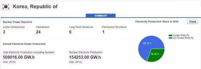 韓國目前有24座在運核反應(yīng)堆,總發(fā)電能力為22,505MWe。它們總共提供了韓國約三分之一的電力。