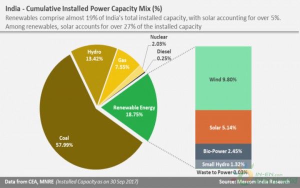 根據(jù)Mercom資本集團(tuán),截止9月底,可再生能源占印度電力裝機(jī)容量的19%。