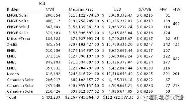 墨西哥能源部2.3吉瓦/5.5TWh(55億度,2020年入網(wǎng))光伏采購競標(biāo)結(jié)果日前出爐,意大利ENEL綠色電力公司報(bào)價(jià)1.77美分/千瓦時(shí)(相當(dāng)于人民幣0.11元/千瓦時(shí)),刷新不久前沙特阿拉伯1.79美分/千瓦時(shí)的光伏報(bào)價(jià)最低紀(jì)錄。在這次墨西哥的光伏項(xiàng)目競標(biāo)中,其他公司(也包括中國公司)的平均報(bào)價(jià)為2.05美分/千瓦時(shí)。