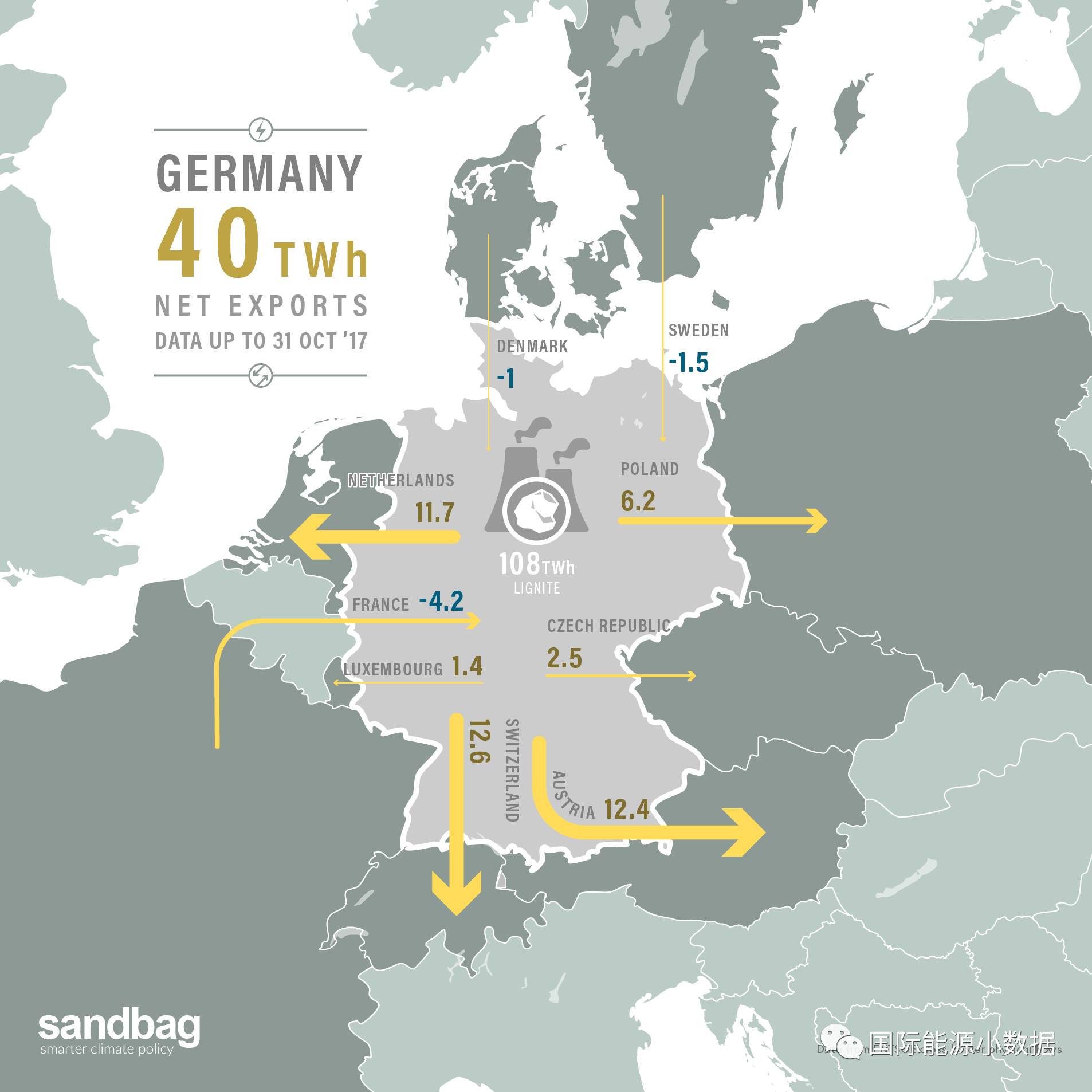 德國是電力出口大國,近兩年的電力凈出口約在470億千瓦時(shí)(47TWh)。2017年1月到10月,德國電力凈出口達(dá)到400億千瓦(比去年同期增長(zhǎng)4%),其中主要出口國是瑞士(126億千瓦時(shí))、奧地利(124億千瓦時(shí))、荷蘭(117億千瓦時(shí))、波蘭(62億千瓦時(shí))、捷克(25億千瓦時(shí))、盧森堡(14億千瓦時(shí));而相對(duì)法國(-42億千瓦時(shí))、瑞典(-15億千瓦時(shí))、丹麥(-10億千瓦時(shí))是凈進(jìn)口。