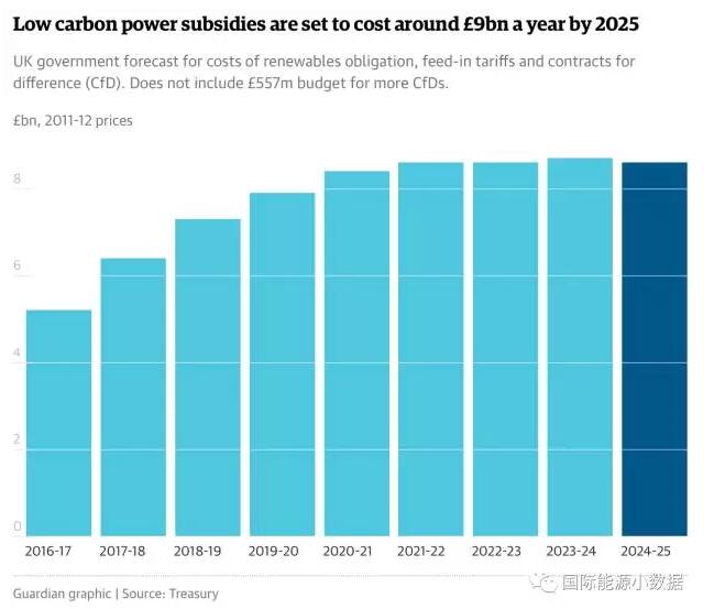 英國(guó)財(cái)政部在日前公布財(cái)政預(yù)算文件中披露,“為了維護(hù)消費(fèi)者的利益”,在2025年以后將停止對(duì)于新建的可再生能源項(xiàng)目的各種財(cái)務(wù)補(bǔ)貼,包括可再生能源強(qiáng)制配額、固定上網(wǎng)電價(jià)、差價(jià)合同等。當(dāng)然,這一決定不會(huì)影響2025年以前的可再生能源項(xiàng)目的持續(xù)補(bǔ)貼。英國(guó)財(cái)政部估算,到2025年對(duì)已經(jīng)投入運(yùn)行的項(xiàng)目補(bǔ)貼將達(dá)到每年90億英鎊。