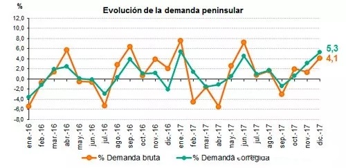 單就12月份數(shù)據(jù)來看,伊比利亞半島12月的電力需求約為22,219GWh,比往年同期增加了4.1%。若將氣溫變化等相關(guān)因素考慮在內(nèi),那么與2016年12相比,該半島電力需求同比上漲了5.3%。