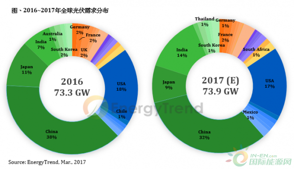 EnergyTrend分析師蔡旻純表示,由于中國目前公布之2017年光伏裝機(jī)目標(biāo)略低于去年,加上美國政策恐不利于光伏發(fā)展、日本躉購費(fèi)率(Feed-in-Tariff)持續(xù)下調(diào)等因素,讓需求強(qiáng)勁成長中的印度有望取代日本成為需求第三大國,占全球比重達(dá)14%。