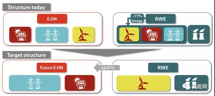 2018年3月12日,兩家德國(guó)能源巨頭E.ON和RWE公開(kāi)表示,他們將對(duì)現(xiàn)有的業(yè)務(wù)進(jìn)行資源交換,E.ON將把可再生能源發(fā)電業(yè)務(wù)出售給RWE,而同時(shí),它將接手RWE旗下Innogy的電網(wǎng)和電力零售業(yè)務(wù)。如下圖所示