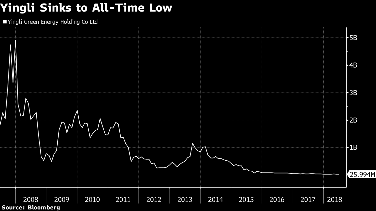 曾經(jīng)一度是全球最大的太陽能電池板制造商英利綠色能源控股有限公司因其價值暴跌而從紐約證券交易所摘牌。這家總部位于中國的保定公司周五在