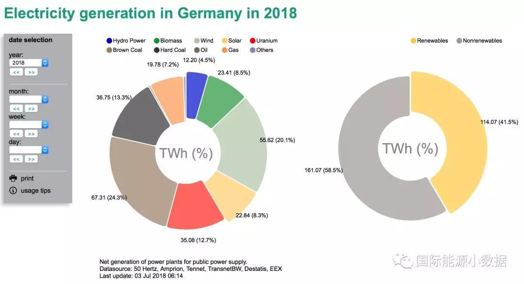 根據德國ISE研究所的最新數據,2018年上半年德國發(fā)電總量為113TWh(1130億千瓦時),可再生能源發(fā)電再創(chuàng)新高,比例達到41 5%(風電20 2%、