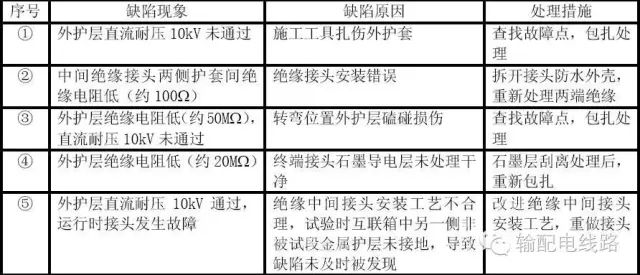 序號①缺陷屬典型施工問題,故障點定位后,施工方即說明該處電纜曾經(jīng)被鐵鍬扎傷過,經(jīng)處理后試驗即通過,這一缺陷暴露了施工管理存在的問題。
