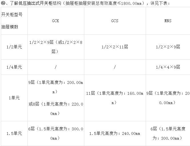 2、GCS、MNS有經(jīng)濟(jì)型與標(biāo)準(zhǔn)型之分;GCK、GCS、MNS還可做成固定分隔式。3、抽屜柜單元抽屜有效安裝尺寸: