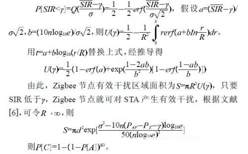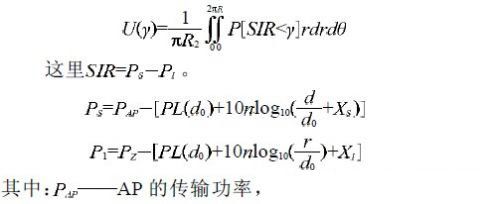 根據(jù)文獻[5]和[6],對于一個半徑為R 的覆蓋區(qū),假設(shè)STA的SIR 的閾值為γ (如果Zigbee 節(jié)點要對STA 產(chǎn)生有效的干擾,使其SIR 必須小于γ ),則有效干擾區(qū)域的百分比為U(γ )(即對于STA的SIR低于γ的區(qū)域百分比),如果在半徑范圍內(nèi)導(dǎo)致SIR低于閾值的概率為P[SIR《γ] ,則: