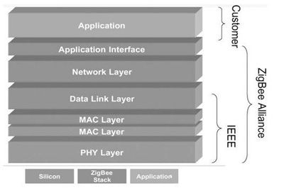 Zigbee不僅只是802.15.4的名字。IEEE僅處理低級MAC層和物理層協(xié)議,因此Zigbee聯(lián)盟對其網(wǎng)絡(luò)層協(xié)議和API進行了標(biāo)準(zhǔn)化(如下圖2所示)。完全協(xié)議用于一次可直接連接到一個設(shè)備的基本節(jié)點的4K字節(jié)或者作為Hub或路由器的協(xié)調(diào)器的32K字節(jié)。每個協(xié)調(diào)器可連接多達255個節(jié)點,而幾個協(xié)調(diào)器則可形成一個網(wǎng)絡(luò),對路由傳輸?shù)臄?shù)目則沒有限制。Zigbee聯(lián)盟還開發(fā)了安全層,以保證這種便攜設(shè)備不會意外泄漏其標(biāo)識,而且這種利用網(wǎng)絡(luò)的遠距離傳輸不會被其它節(jié)點獲得。