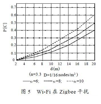 針對上述模型做定性分析,由于Zigbee 底層協(xié)議IEEE802.15.4 中有著特殊的睡眠機制,節(jié)點處于活動狀態(tài)的概率一般小于1 %[4],γ可取為10dBm[7],AP 和Zigbee 的傳輸功率分別為14 dBm 和0 dBm。根據(jù)文獻[6],分組出錯率的期望E[PER]=P[C] ,分組沖突概率越大,相應(yīng)的分組出錯率也越大。從圖5 可以看出,隨AP和STA 的距離d以及δ的增大,系統(tǒng)的性能越差。