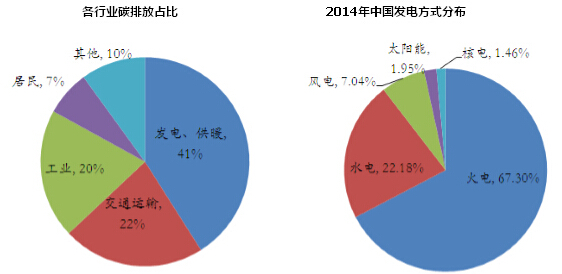 雖然早在1998年,中國就加入了《聯(lián)合國氣候變化框架公約的京都議定書》,其中約定發(fā)展中國家沒有減排的義務,但是為了應對哥本哈根世界氣候大會對碳減排義務和量重的重新劃分,中國有義務承擔“后京都時代”的大國責任,必須大量減少CO2等溫室氣體的排量。要想減少碳排放,就得從根源上做好控制。通過中國各行業(yè)碳排放的占比數(shù)據(jù)可以看出,電力行業(yè)是碳排放最大的領(lǐng)域,達到40%,且中國電力行業(yè)65%以上的來源仍依靠傳統(tǒng)的火力發(fā)電