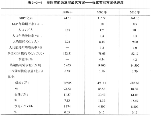 貴陽市能源發(fā)展最優(yōu)方案——強化節(jié)能方案低速度列于表3-3-4。