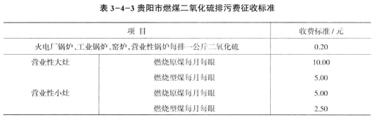 貴陽市1990年就開始對7個主要行業(yè),按國家“準污染、誰治理”、“準污染、誰負擔(dān)”的原則,對燃煤二氧化硫污染實行總量收費政策,每公斤二氧化硫收費為0.2元。1991年,貴陽市政府擬定了《貴陽市二氧化硫排污費征收標準》,明確了收費范圍、收費辦法、收費的管理和使用辦法等有關(guān)事宜。1993年7月開始對經(jīng)營性燃煤排放征收二氧化硫排污費。貴陽市燃煤二氧化硫排污費征收標準列于表3-4-3 。