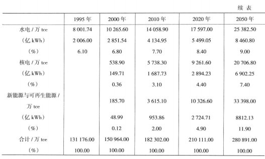 到2000年、2010年、2020年以及2050年,能源生產(chǎn)中煤炭的降低量將由水電、核電以及新能源與可再生能源替代。2000-2050年,水電年平均增加3 323萬tce、核電增加3 833萬tce、新能源與可再生能源增加13 310萬tce。