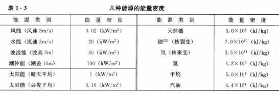 能量密度是指在一定的質(zhì)量、空間或面積內(nèi),從某種能源中所能得到的能量。顯然,如果能量密度很小,就很難用作主要能源。例如,太陽能和風(fēng)能的能量密度就很小,各種常規(guī)能源的能量密度都比較大,核燃料的能量密度最大。幾種能源的能量密度見表1-3。