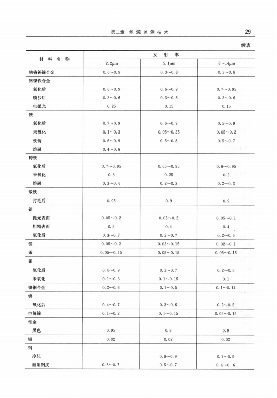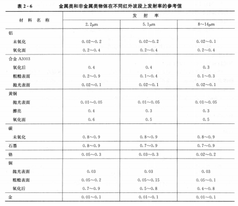 表2-6給出了金屬類和非金屬類物體在不同紅外波段上發(fā)射率的參考值。值得注意的是,表中的數(shù)據(jù)只是近似值,因為發(fā)射率還受物體表面光潔程度和溫度的影響。