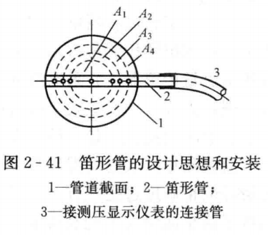 對于一維的管流流動,人們經(jīng)常使用一種像笛子形狀的測壓管,稱為笛形管。在管道內(nèi)安裝的笛形管見圖2-41。笛形管的設計思想是將被測量管的截面分成若干的同心圓,每個圓環(huán)的面積均相等,即