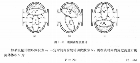 (1)橢圓齒輪流量計(jì)。橢圓齒輪流量計(jì)工作原理:兩個(gè)橢圓齒輪具有相互滾動(dòng)并進(jìn)行接觸旋轉(zhuǎn)的特殊形狀,見圖2-61。圖中Pi和p2分別表示人口壓力和出口壓力,顯然p1>p2。在圖2-61(a)所示位置時(shí),上方齒輪為主動(dòng)輪,下方齒輪則為從動(dòng)輪;當(dāng)旋轉(zhuǎn)到圖2-61(c)所示位置時(shí),下方齒輪變?yōu)橹鲃?dòng)輪,上方齒輪則為從動(dòng)輪,完成一個(gè)循環(huán)。一次循環(huán)動(dòng)作排出四個(gè)由齒輪與殼壁間圍成的新月形空腔的流體體積,該體積稱作流量計(jì)的循環(huán)體積。