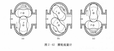 (2)腰輪流量計(jì)。腰輪流量計(jì)又稱羅茨流量計(jì),工作原理與橢圓齒輪流量計(jì)相同,特點(diǎn)是腰輪上沒有齒,它們不是直接相互嚙合轉(zhuǎn)動(dòng),而是通過安裝在殼體外的傳動(dòng)齒輪組進(jìn)行傳動(dòng),即腰輪流量計(jì)的轉(zhuǎn)子是一對(duì)不帶齒的腰形輪,在轉(zhuǎn)動(dòng)過程中依靠套在殼體外的與腰輪同軸上的嚙合齒輪來完成驅(qū)動(dòng),其結(jié)構(gòu)見圖2-62。腰輪流量計(jì)除可測量液體外,還可測量氣體,精度可達(dá)±0.1%,并可做標(biāo)準(zhǔn)表使用,最大流量可達(dá)1000m3/h。