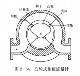 (3)刮板流量計(jì)。如圖2-64所示,轉(zhuǎn)子在流量計(jì)進(jìn)、出口差壓作用下轉(zhuǎn)動(dòng),當(dāng)相鄰兩刮板進(jìn)入計(jì)量區(qū)時(shí),均伸出至殼體內(nèi)壁且只隨轉(zhuǎn)子旋轉(zhuǎn)而不滑動(dòng),形成具有固定容積的測量室,當(dāng)離開計(jì)量區(qū)時(shí),刮板縮入槽內(nèi),流體從出口排出,同時(shí)后一刮板又與其另一相鄰刮板形成測量室。轉(zhuǎn)子旋轉(zhuǎn)一周,排出4份固定體積的流體,由轉(zhuǎn)子的轉(zhuǎn)數(shù)就可以求得被測流體的流量。