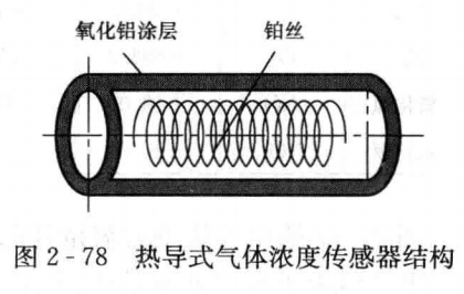 這種分析儀的氣體傳感器結構如圖2-78所示。它是用直徑為50~60tjm的高純鉑絲繞制成直徑大約為0.5mm的線圈,線圈的圈數(shù)應使鉑電阻達到適當?shù)淖柚怠T诰€圈的外面涂以膏狀氧化鋁涂層并燒結而成,涂覆氧化物的目的是延長鉑絲的使用壽命。對線圈通以一定的電流加熱,并將其作為平衡電橋的橋臂之一。由于金屬絲溫度較高,當被分析的氣體通過有該金屬絲的橋臂室(又稱發(fā)送器)時,因氣體導熱系數(shù)不同,其散熱能力也不同,從而使金屬絲的溫度和電阻值也不同,于是原來平衡的電橋就會失去平衡,不平衡的電橋將輸出一個不平衡的電壓,儀器根據(jù)此不平衡電壓即可顯示出被測氣體中某組分的濃度。