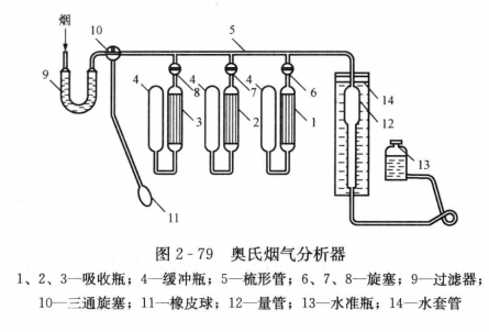 奧氏煙氣分析器是經(jīng)典的用來測定煙氣中二氧化碳、氧氣和一氧化碳等的百分含量的常規(guī)儀器。它是采用化學分析法的典型,其原理是利用某些化學試劑對煙氣中某一組分具有選擇性吸收的特點,以分別確定各組分的含量。它由煙氣過濾器、3個吸收器、量筒、玻璃套筒(內(nèi)儲水,以保持煙溫恒定)、平衡瓶(調(diào)節(jié)量筒中水位)、梳形管和三通旋塞等組成(見圖2-79)。為便于觀察,各部件都用玻璃制成。第一個吸收器內(nèi)儲有無色苛性鉀溶液,用來同時吸收C02和S02;第二個吸收器中裝有褐色焦性沒食子酸苛性鉀溶液,可同時吸收C02、S02和02(如前兩者已被第一吸收器所充分吸收,則只需吸收02);第三個吸收器內(nèi)盛有青色的氯化亞銅的氨溶液,主要用來吸收一氧化碳(同時也能吸收氧氣和乙炔等)。