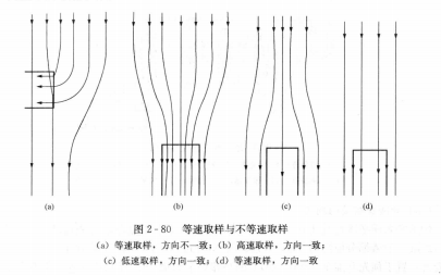 為了正確測得煙氣中各成分的濃度,取樣必須在等速的條件下進行,即進入取樣探頭進口的吸人速度與探頭周圍煙道中的煙氣流速相等。當不等速取樣時,流線會有如圖2-80所示的變化。圖2-80(a)取樣管不對準氣流,流線彎曲,煙氣中的固體顆粒與氣相嚴重分離;圖2-80(b)取樣速度太高,流線收縮;圖2-80(c)取樣速度太低,流線膨脹;圖2-80(d)為正常的等速取樣。