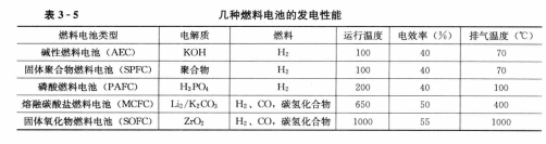 燃料電池是21世紀(jì)各國研究的重點,燃料電池和IGCC組合的聯(lián)合循環(huán)代表了當(dāng)今的發(fā)展方向,它的最大優(yōu)點是效率高,CO2排放少。表3-5給出了幾種燃料電池的發(fā)電性能。