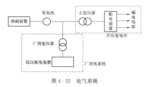 (3)電氣系統(tǒng)。電氣系統(tǒng)如圖4-32所示,包括發(fā)電機、勵磁系統(tǒng)、廠用電系統(tǒng)和升壓變電站等。