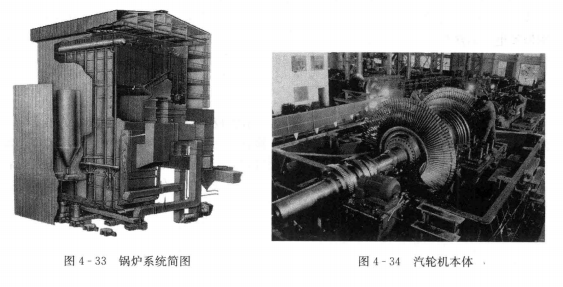 (1)鍋爐本體。鍋爐設備是火力發(fā)電廠中的主要熱力設備之一,其系統(tǒng)簡圖如圖4-33所示。由爐膛、煙道、汽水系統(tǒng)(其中包括受熱面、汽包、聯(lián)箱和連接管道)以及爐墻和構(gòu)架等部分組成的整體,稱為“鍋爐本體”。它的作用是使燃料在爐膛中燃燒放熱,并將熱量傳給工質(zhì),以產(chǎn)生一定壓力和溫度的蒸汽,供汽輪發(fā)電機組發(fā)電。目前,在我國大型電廠多用煤粉爐和沸騰爐。電廠鍋爐與其他行業(yè)所用鍋爐相比,具有容量大、參數(shù)高、結(jié)構(gòu)復雜、自動化程度高、熱效率高等特點。電站鍋爐的各項操作基本實現(xiàn)了機械化和自動化,適應負荷變化的能力很強,工業(yè)鍋爐目前僅處于半機械化向全機械化發(fā)展的過程中;電站鍋爐的熱效率在90%以上,工業(yè)鍋爐的熱效率多在60%~80%之間。