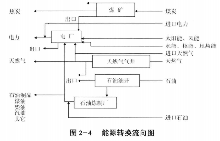 模型設(shè)置了能源轉(zhuǎn)換子模塊。能源轉(zhuǎn)換子模塊將以終端能源需求預(yù)測數(shù)據(jù)為基礎(chǔ),模擬其轉(zhuǎn)化過程。例如水力發(fā)電和石油的終端消費燃料為電力與煤油、汽油、柴油等,詳見圖2-4,從圖2-4看出,直接取自自然界的一次能源量經(jīng)過各種轉(zhuǎn)換過程后變成二次能源、二次能源將被人們所利用。一般地說,其轉(zhuǎn)換率越高,越有利于能源效率的提高及環(huán)境的保護。模型能源轉(zhuǎn)換子模塊將計算本地資源量是否能滿足其需求,以及由此引起的進出口量,實現(xiàn)需求與資源轉(zhuǎn)化的平衡,形成未來能源的供應(yīng)方案。