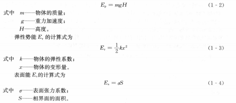 勢能與物體的狀態(tài)有關(guān),除了受重力作用的物體因其位置高度不同而具有所謂重力勢能外,還有彈性勢能(即物體由于彈性變形而具右的做功本領(lǐng))和表面能(即不同類物質(zhì)或同類物質(zhì)不同相的分界面上,由于表面張力的存在而具有的做功能力)。重力勢能Ep可以用式(1-2)計算,即