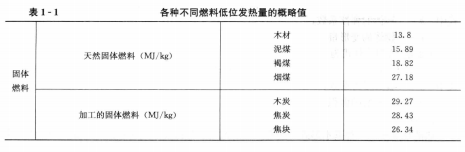單位質(zhì)量(對固體、液體燃料)或體積(氣體燃料)的燃料在完全燃燒,且燃燒產(chǎn)物冷卻到燃燒前的溫度時,所放出的熱量稱為燃料的發(fā)熱量(發(fā)熱值或熱值),單位為kJ/kg或kJ/m3。應用上又將發(fā)熱量分為高位發(fā)熱量和低位發(fā)熱量。高位發(fā)熱量是指燃料完全燃燒,且燃燒產(chǎn)物中的水蒸氣全部凝結(jié)成水時所放出的熱量;低位發(fā)熱量是燃料完全燃燒,而燃燒產(chǎn)物中的水蒸氣仍以汽態(tài)存在時所放出的熱量。顯然,低位發(fā)熱量在數(shù)值上等于高位發(fā)熱量減去水的汽化潛熱。由于燃燒設(shè)備,如鍋爐中燃料燃燒,燃料中原有的水分及氫燃燒后生成的水均呈蒸汽狀態(tài)隨煙氣排出,因此低位發(fā)熱量接近實際可利用的燃料發(fā)熱量,所以在熱力計算中均以低位發(fā)熱量作為計算依據(jù)。表1-1為各種不同燃料低位發(fā)熱量的概略值。
