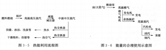 因此,總能系統(tǒng)的指導(dǎo)思想是先做功后用熱,即燃料的能量先通過汽輪機或燃氣輪機或內(nèi)燃機做功或發(fā)電,然后把低品位熱量作為熱源加以利用;對于工藝過程放出的熱量,先做功后再作為熱源使用。典型例子如圖3-6所示。