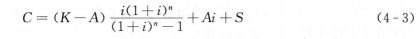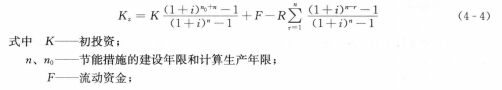 一項(xiàng)節(jié)能措施的投資K,可以按給定的利率i和使用年限n折算成一定的金額,用于在使用期內(nèi)每年還本和付息,以保證投資在使用年限期滿時(shí)全部還原,這就是所謂資金費(fèi)用。如果資金費(fèi)用再加上每年的運(yùn)行維護(hù)費(fèi)用S,就構(gòu)成了等效年成本。當(dāng)計(jì)及投資在使用期滿的殘值A(chǔ)時(shí),應(yīng)將殘值從投資中扣除,另加殘值的利息。因此節(jié)能措施的等效年成本C可按下式計(jì)算
