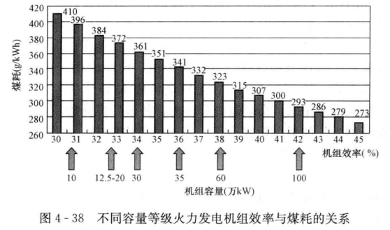 由圖4-38可以看出,單臺發(fā)電機(jī)組容量越大,單位煤耗越小。因此,關(guān)停小容量機(jī)組,推廣大容量機(jī)組對減少能耗、提高能源利用率具有重大意義。
