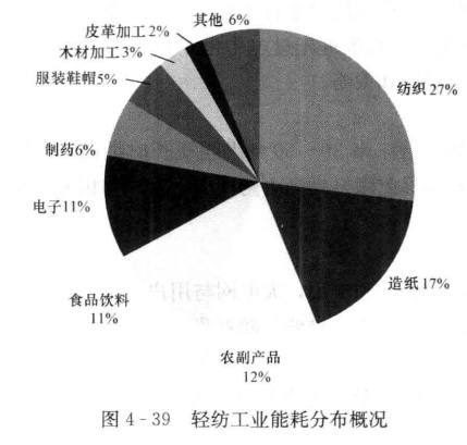 從能源消耗情況來看(見圖4-395,輕紡工業(yè)中紡織、造紙是能耗最大的兩個行業(yè),能源消耗量分別占輕紡工業(yè)能耗總量的27%和17%。